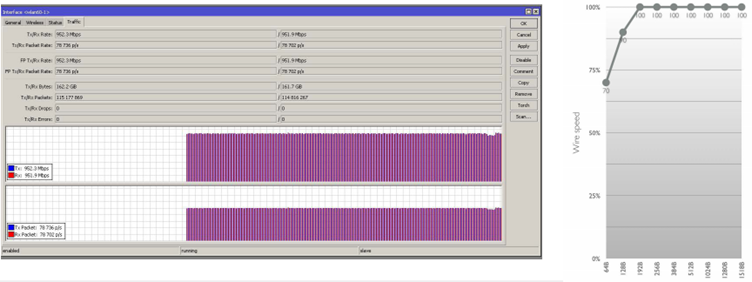 RBLHGG-60ad trang bị bộ xử lý CPU mạnh mẻ, giúp thiết bị xử lý lưu lượng dữ liệu Gigabit với hầu hết mọi kích thước của packet. Hình ảnh bên trái cho thấy kết quả truyền và nhận dữ liệu ổn định ở tốc độ gần 2 Gbps. Hình ảnh bên phải cho thấy kết quả so sánh với kết nối cáp (wire speed) mà bộ kít Wire wireless Dish đạt được căn cứ trên các kích thước Ethernet frame khác nhau.
