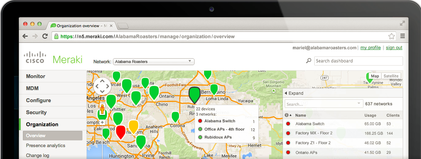 Cisco Meraki quản lý thiết bị access point phân tán ở các vùng địa lý khác nhau, với số lượng thiết bị lên đến vài ngàn thông qua Google Map trên nền tản Cloud Controller.