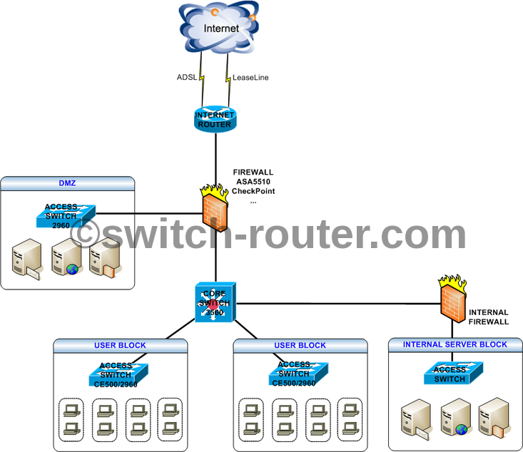 - Kết nối ra ngoài Internet là 1 gateway Cisco Router, Router này cung cấp các giao diện (Interface) tương ứng để kết nối với các kiểu đường truyền ra Internet, ví dụ: ADSL, FTTH, Leaseline, …